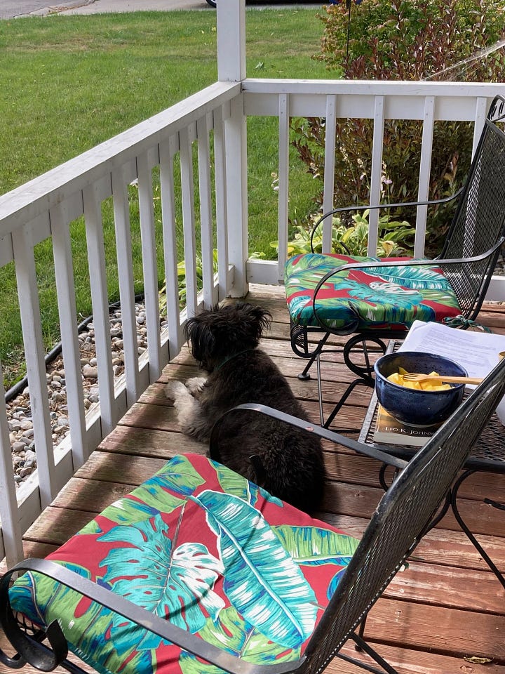 I love that my front porch faces to the east. There is just one small maple tree in my tiny front yard, and the morning sun shines directly onto my porch. I start my day, every day, sitting on this porch. We have been blessed in southern Michigan with endless sunny days in September and October this year, so I have enjoyed the sweet company of warm sunshine for most of my front porch mornings. Every now and then it’s been cool and cloudy, or even drizzling rain….and I love my morning porch time then, too. It has become a ritual, for my old dog Sadie and me.