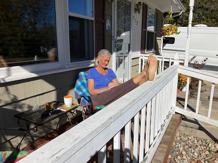 My morning porch-time is a time of self-inquiry, and usually includes some meditation, some inspired reading, and some personal writing in my journal. Sometimes a neighbor wanders over for a brief hello and check-in, or a neighbor from up the street gives a friendly little honk as they drive by on their way somewhere. I have become a familiar morning sight in the neighborhood, apparently. (I do have a secluded backyard patio, to the west, when I want total privacy.) I love my morning ritual, which embodies and instructs the slower pace of life that I have come to cherish these days, and helps me to align myself well for the new day. Later in the afternoons, I often walk or ride my bike to one of my favorite neighborhood nature-spots, for some quiet contemplation time in the surround of bigger nature.