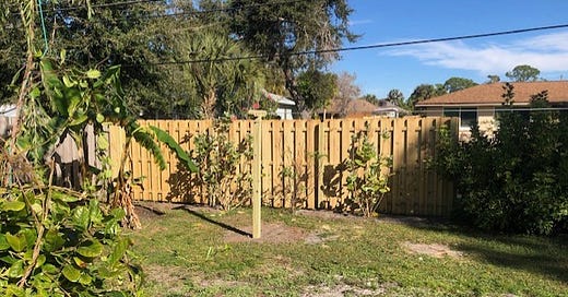 As many of my readers know, I recently sold my house and moved to a new one. Within the first month or so, the buyers of my previous home, and myself at my new home, have both erected new fences where none existed before. Theirs is eight feet high, runs the whole 125-foot length of the southern property line, and required the removal of large living trees. Mine is six feet high, just 48-feet long (only a part of my northern border), and leaves an eight-foot gap for a large existing bush to happily stay put. As far as I know, our primary aim was the same: more privacy. And, as far as I know, none of us dislikes the neighbors on the other side of the boundary. Their fence provides a near-complete separation; mine only partial. I generally enjoy encouraging some sense of easy-going relations with my neighbors, yet I also wanted privacy around my bedroom, hot tub, and backyard sun-bathing spot. Also, shorter fence sections will be less vulnerable in a hurricane, and require less maintenance.