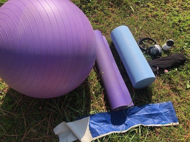 I will often bring a yoga mat, some resistance bands, a foam roller, and an exercise ball if space permits. If I need to travel extra lightly, then just resistance bands. I also bring an eye-cover and miniature white-noise gadget for sleep protection, and ear-buds or sound-canceling headphones so I can relax privately, tune-in and wind-down from all the travel activities, with soothing music or guided meditations. I have learned to take care of my needs without worrying about what other people will think. I definitely get some fun comments and curious questions when I am stretching or moving my body at rest areas, or enjoying my attractive spread of colorful fruit.