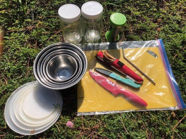 Now that you are inspired about a travel journey in which you get to have fun while being grounded and resilient, and committed to the boundaries that will support you bringing your best self along, what preparation details do you need to attend to? For me, traveling raw-vegan-style generally means that I need to bring a lot of my own fruit and snacks, as well as basic kitchen supplies if I will not be staying in well-equipped places. For car travel, I bring a flexi-plastic cutting board cut to fit into a gallon zip-loc bag, with a couple of differently sized knives with protective sheaths on their blades. I pack nesting metal bowls with lids, bags or a bucket for compost, and my own silverware. I bring paper towels, dish towels, or natural baby wipes for cleaning fruit-prep stickiness. I bring a veggie-peeler and a mini-spiralizer, and I might bring a blender. I always have a simple backpack for carrying my supplies or groceries, and some kind of picnic blanket.